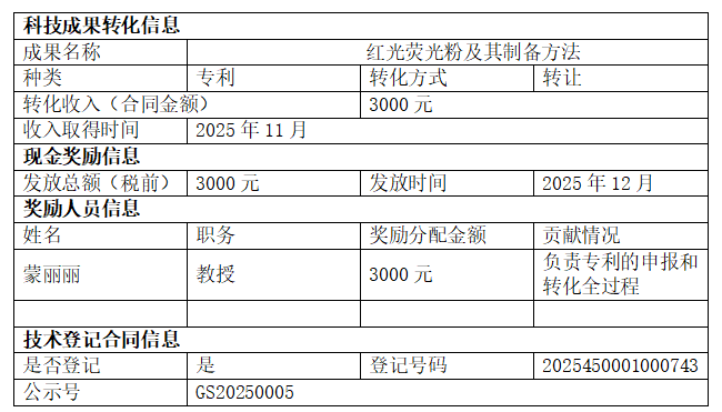 根据《财政部税务总局科技部关于科技人员取得职务科技成果转化现金奖励信息公示办法的通知》及《南宁师范大学科技成果使用处置和收益管理实施细则》(南师发〔2024〕124号),现对我校“蒙丽丽”等1项发明专利科技成果转化项目现金奖励相关信息公示如下: