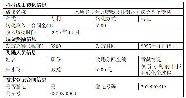 根据《财政部税务总局科技部关于科技人员取得职务科技成果转化现金奖励信息公示办法的通知》及《南宁师范大学科技成果使用处置和收益管理实施细则》(南师发〔2024〕124号),现对我校“木质素型苯并噁嗪及其制备方法”等2项发明专利科技成果转化项目现金奖励相关信息公示如下: